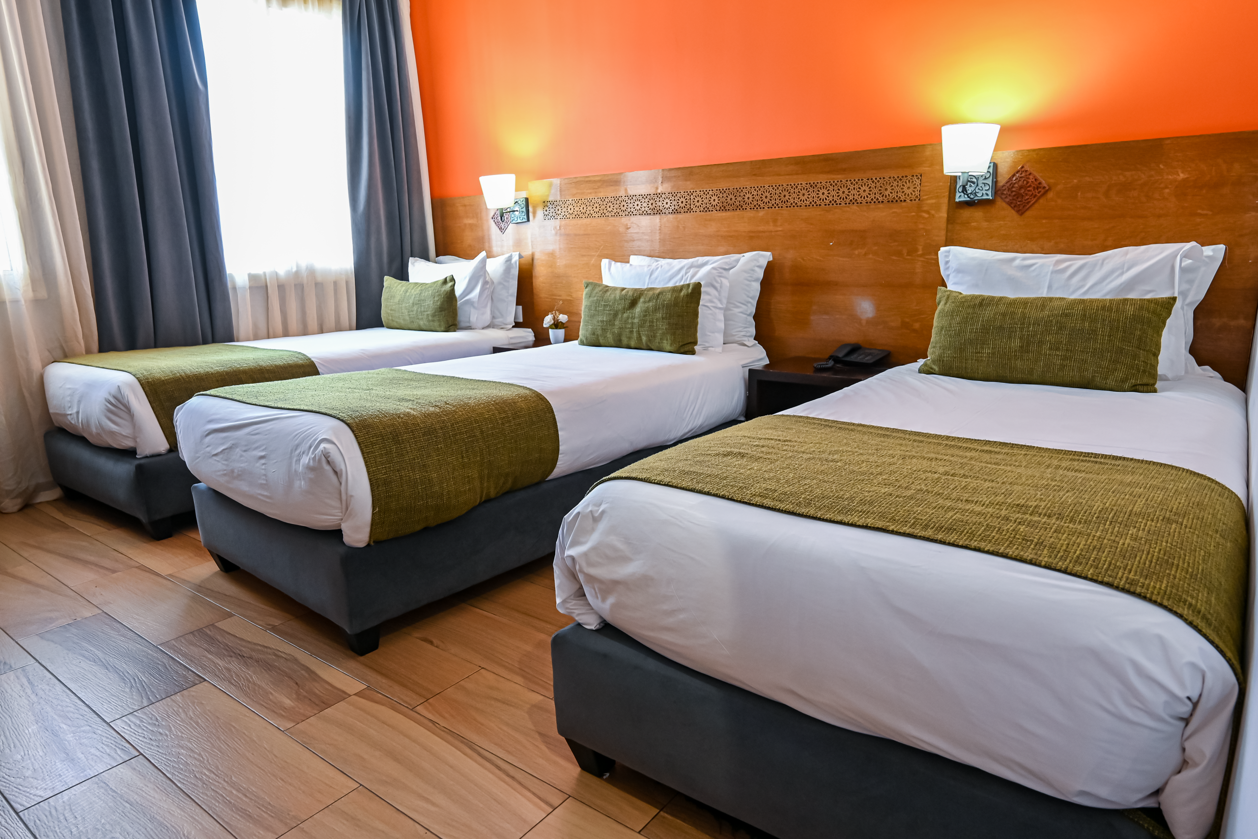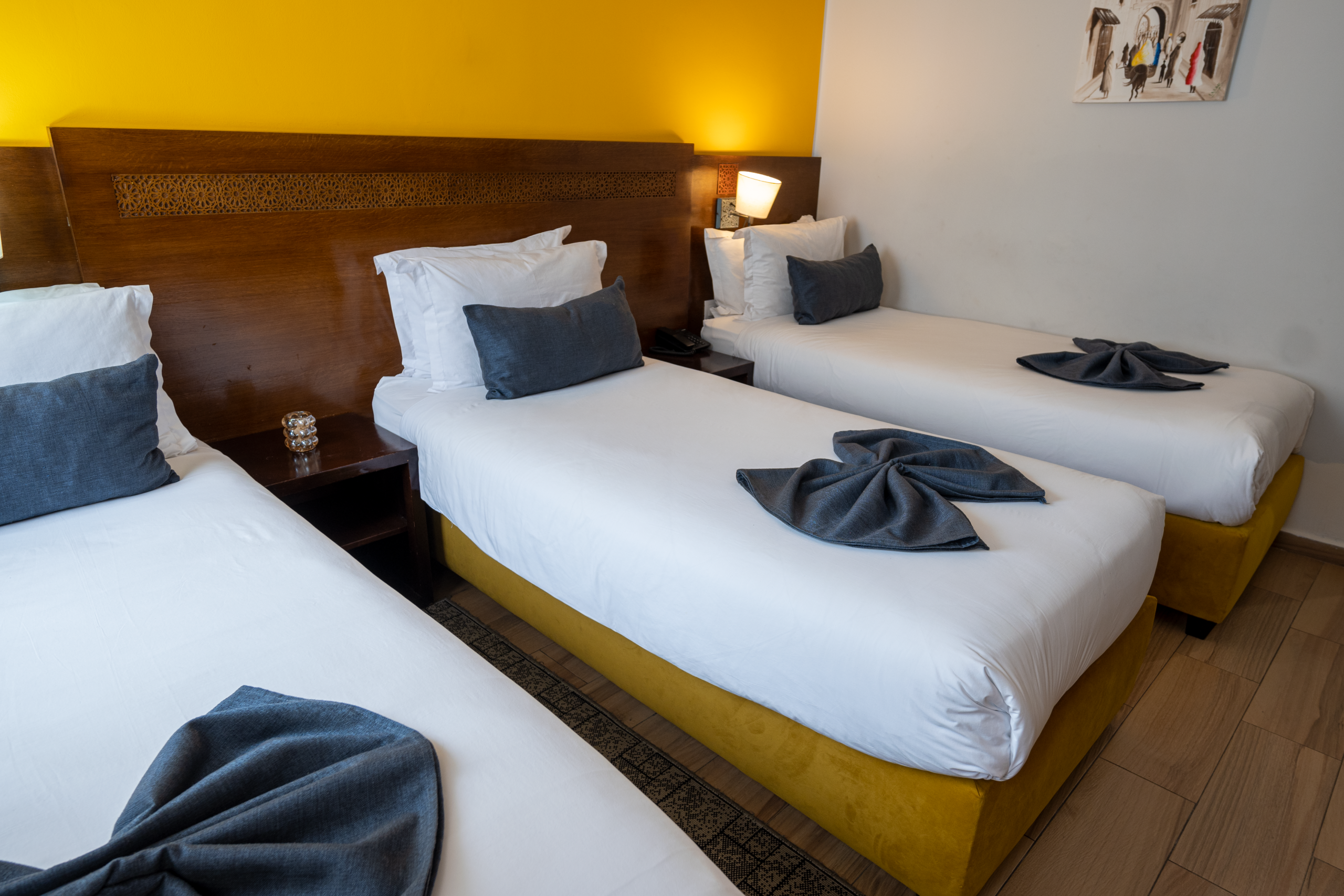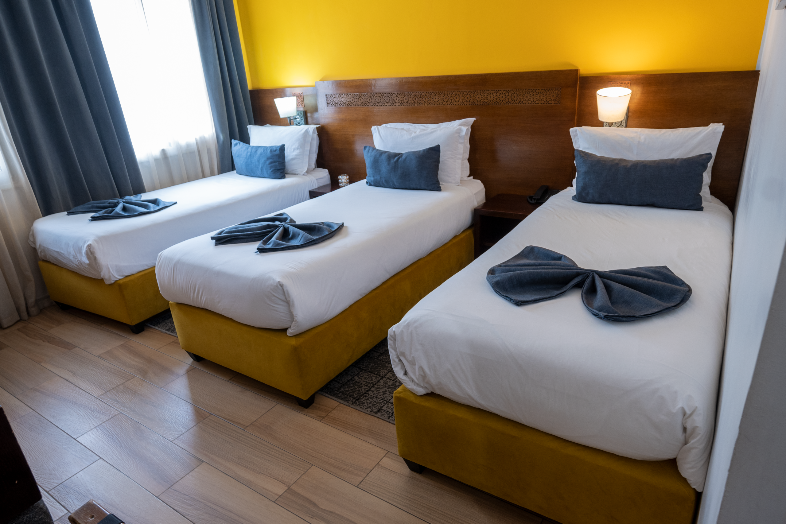 Conçues pour accueillir jusqu’à trois personnes, nos Chambres Triple Standard offrent un espace confortable de 20 à 25 m², idéal pour un séjour entre amis ou en famille. Elles disposent de trois lits simples (90 x 200 cm) et sont parfaitement équipées pour assurer confort et fonctionnalité.