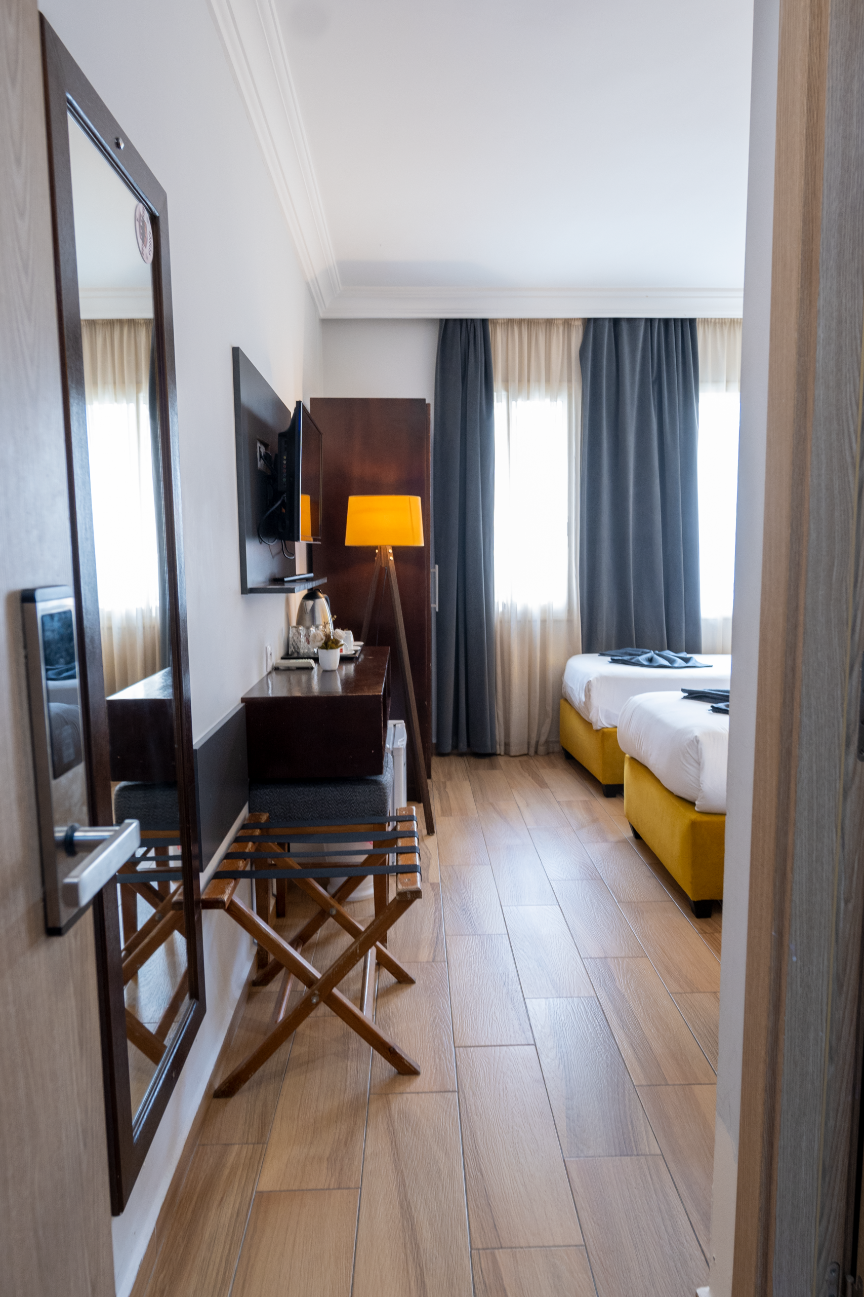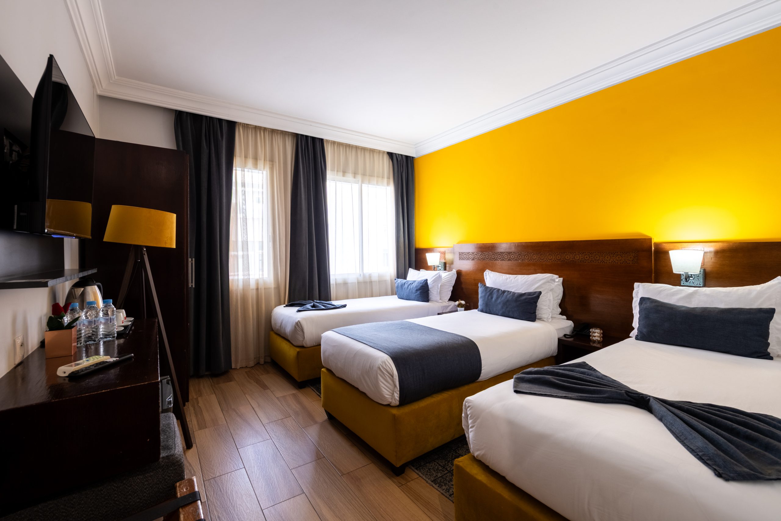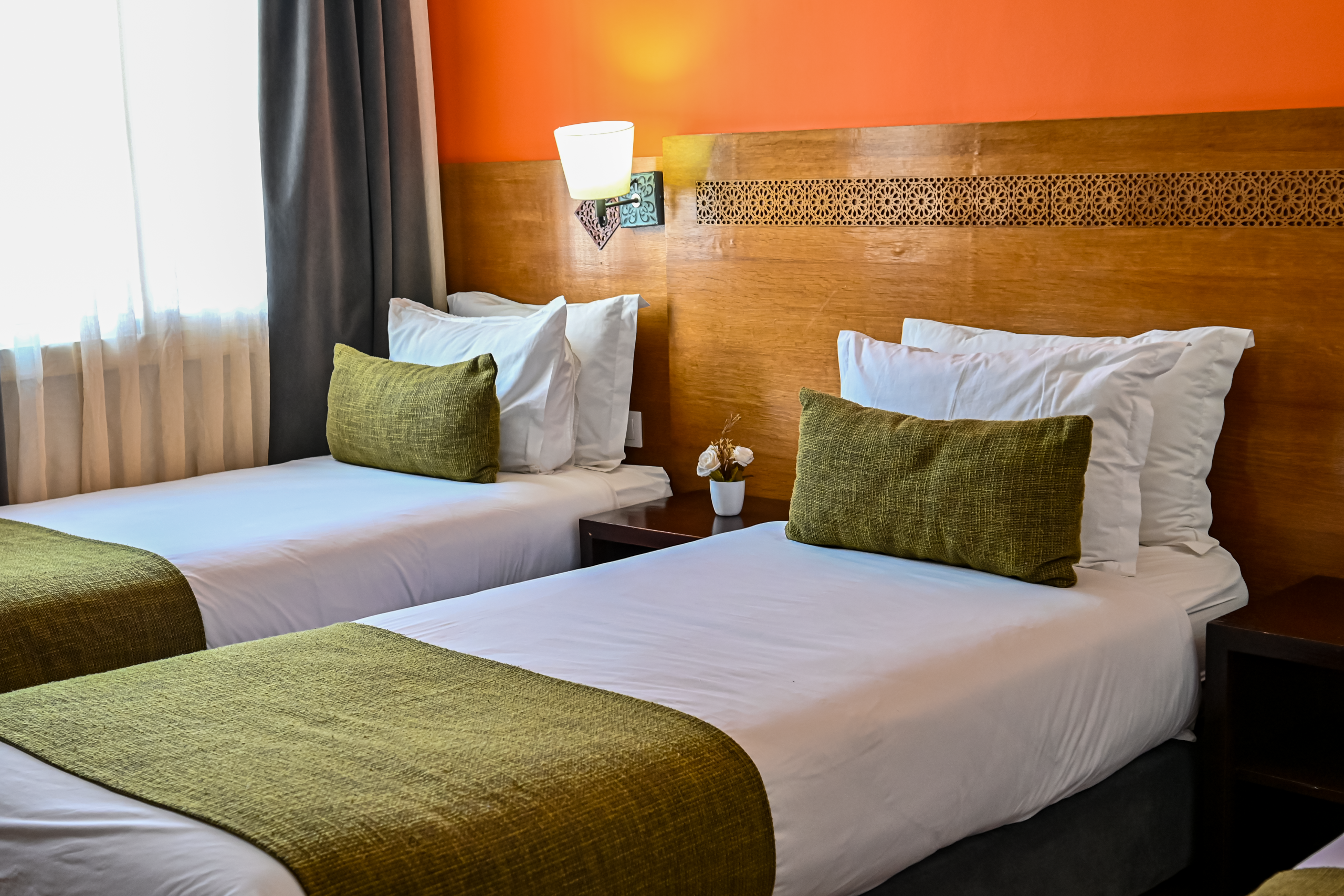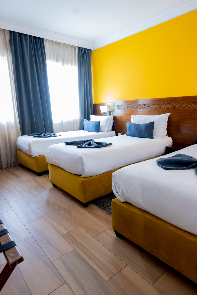 Conçues pour accueillir jusqu’à trois personnes, nos Chambres Triple Standard offrent un espace confortable de 20 à 25 m², idéal pour un séjour entre amis ou en famille. Elles disposent de trois lits simples (90 x 200 cm) et sont parfaitement équipées pour assurer confort et fonctionnalité.