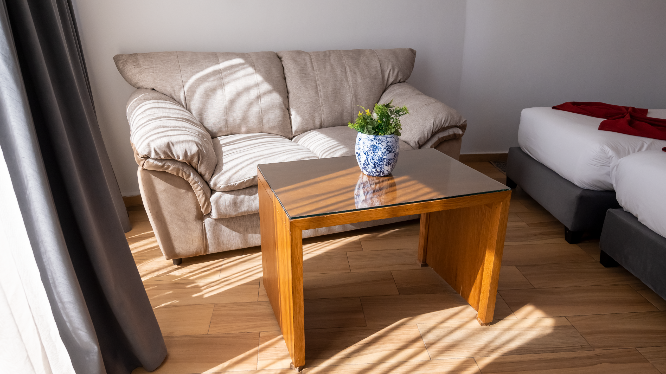Une chambre twin avec deux lits simples, un canapé, une table,